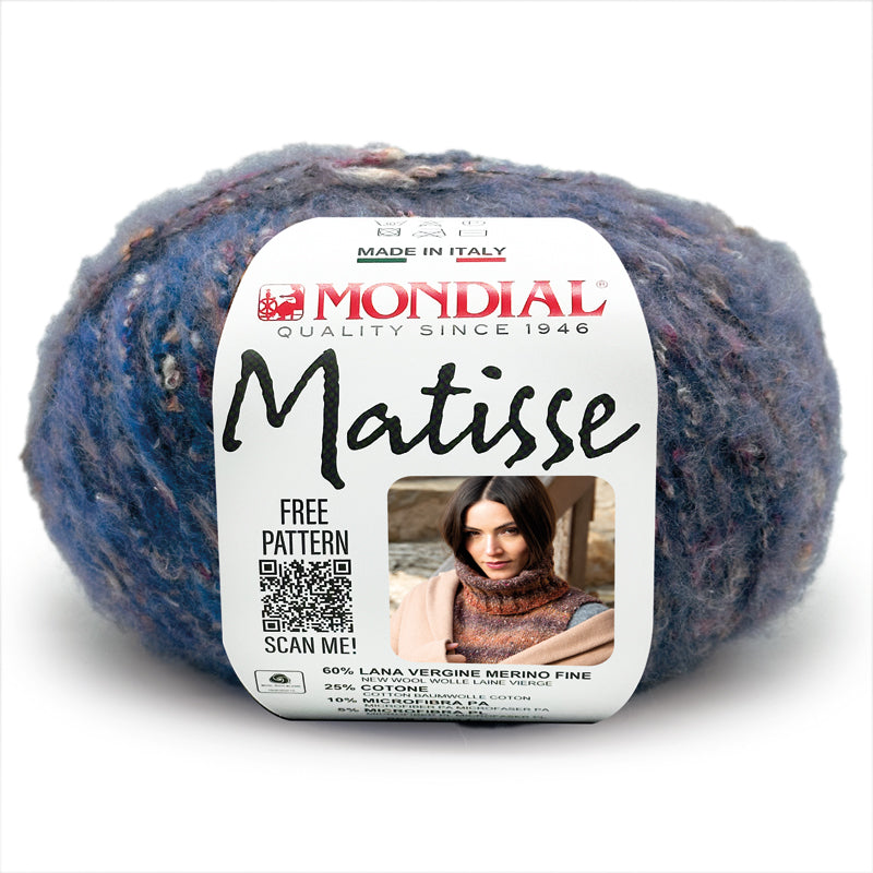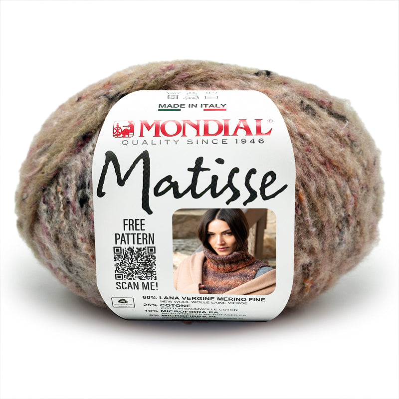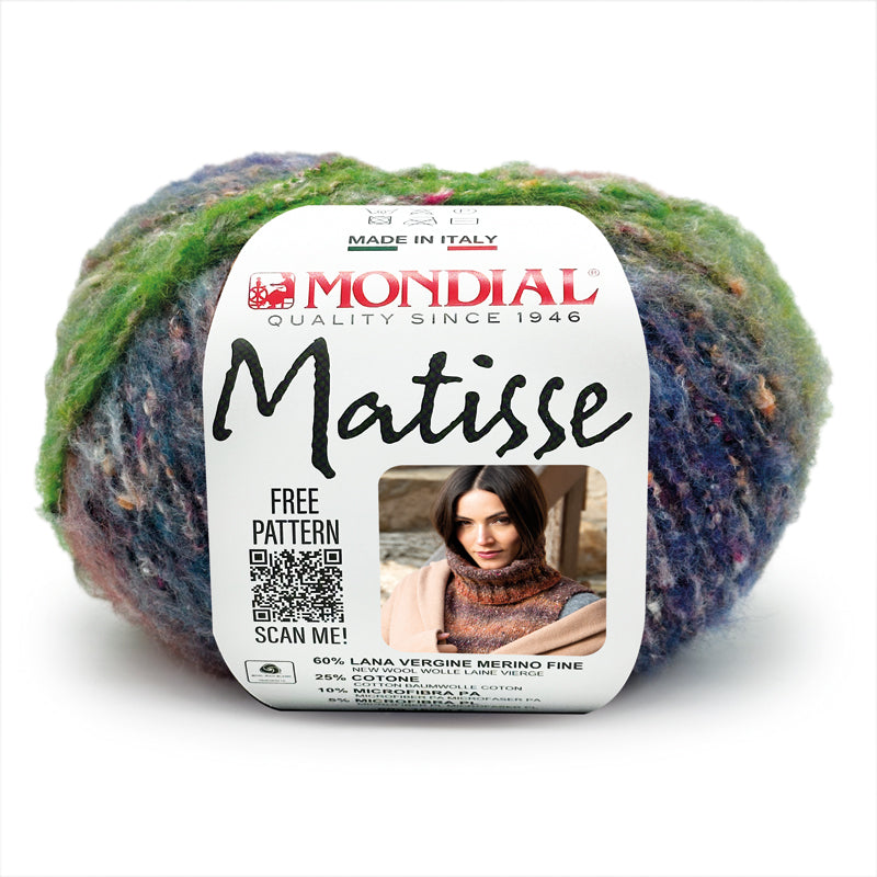 Matisse er et eksklusivt tweedgarn fra Mondial, perfekt til både strik og hækling. Den særlige fiberblanding giver garnet en flot, levende struktur og en behagelig følelse mod huden.