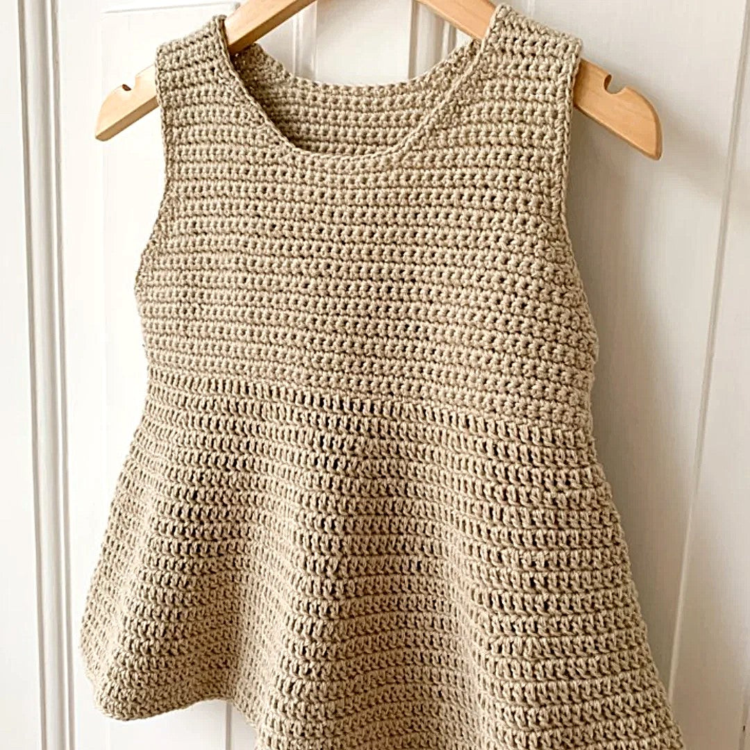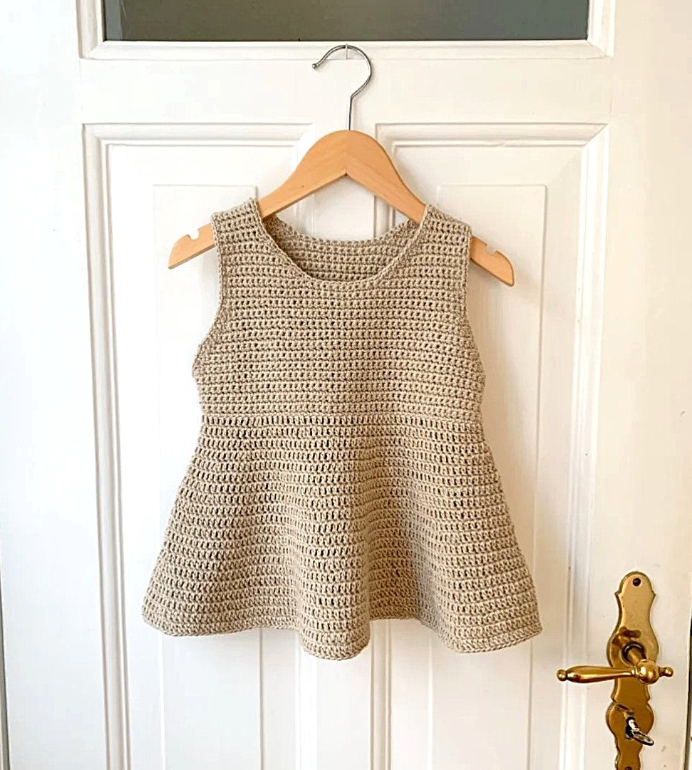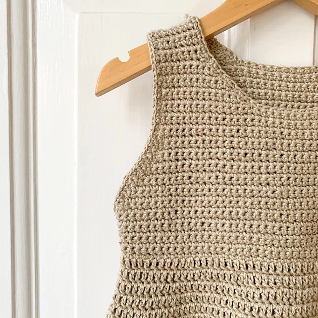 Designet har et kropsnært bærestykke og en mere løstsiddende underdel, der giver et fint og luftigt fald. En skøn model til både leg og hverdag, og et ideelt projekt til dig, der elsker at hækle sommertøj med et naturligt udtryk.